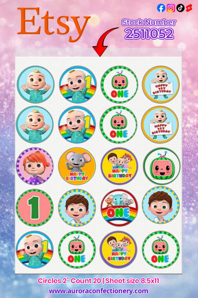 Our Cocomelon-inspired first birthday edible cupcake toppers are the perfect way to add bright, cheerful fun to your little one’s celebration. Printed on a premium 8.5″ x 11″ frosting sheet, these colorful designs feature adorable characters, “ONE” icons, and birthday graphics ready to transform cupcakes, cookies, and cake pops. Ideal for parents and party planners looking for fast, professional decorating with vibrant, food-safe edible images.
