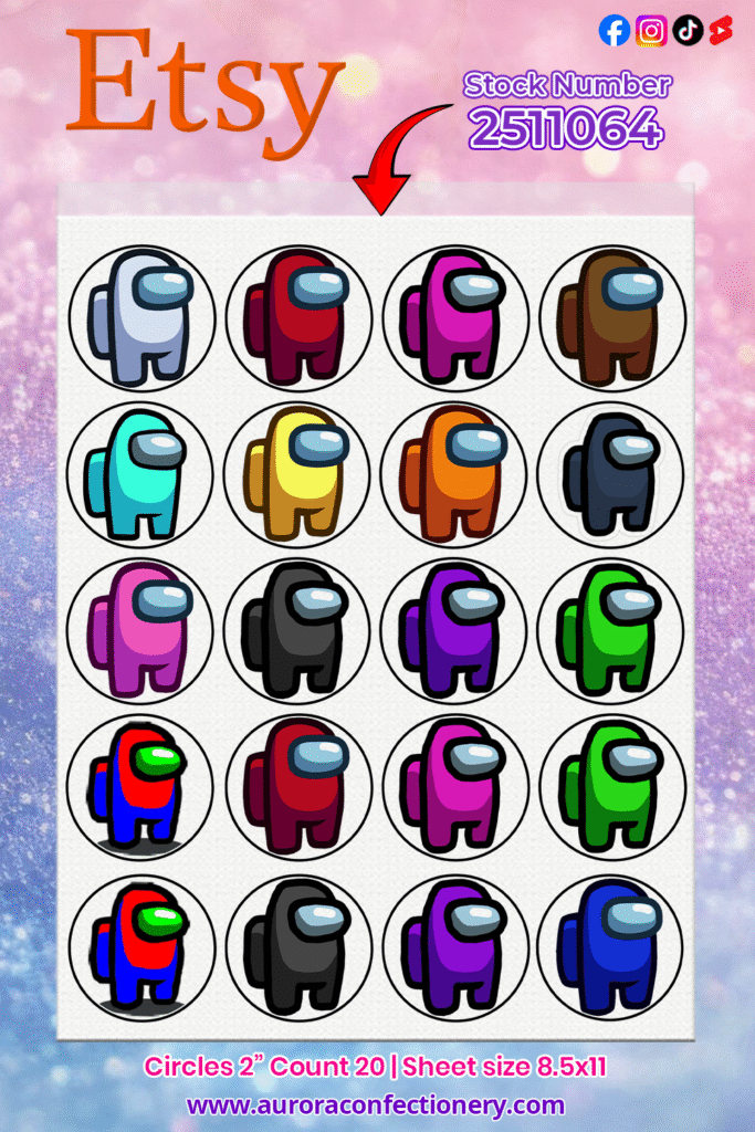These Among Us edible cupcake toppers add bold color and playful character art to your desserts with almost no effort. Perfect for birthdays, themed parties, and gaming events, they help create memorable treats that stand out. When you’re ready to order, make sure to use Stock #2511064 so we print this exact design for you.