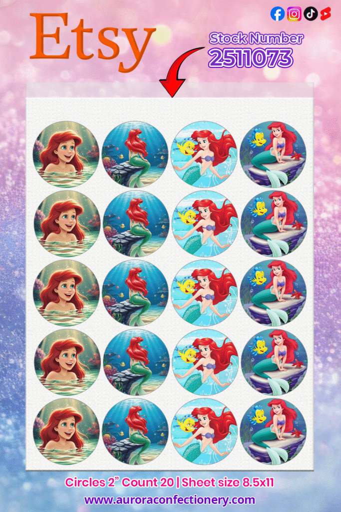 Our Ariel-inspired mermaid edible images are perfect for bringing magical under-the-sea charm to your next celebration. Printed on a premium 8.5″ x 11″ frosting sheet, these vibrant designs make decorating cupcakes, cookies, and cake pops fast, easy, and beautiful. Ideal for birthdays, themed parties, or dessert tables that need a pop of ocean sparkle.