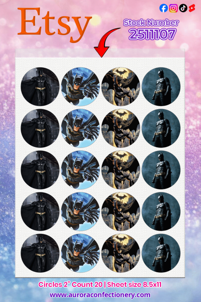 These Dark Hero edible cupcake toppers are ideal for superhero birthdays, themed parties, movie nights, and dramatic dessert spreads. Our premium edible printing ensures vivid color and sharp detail on every sheet. When you’re ready to order, make sure to use Stock #2511107 so we print this exact design for you.