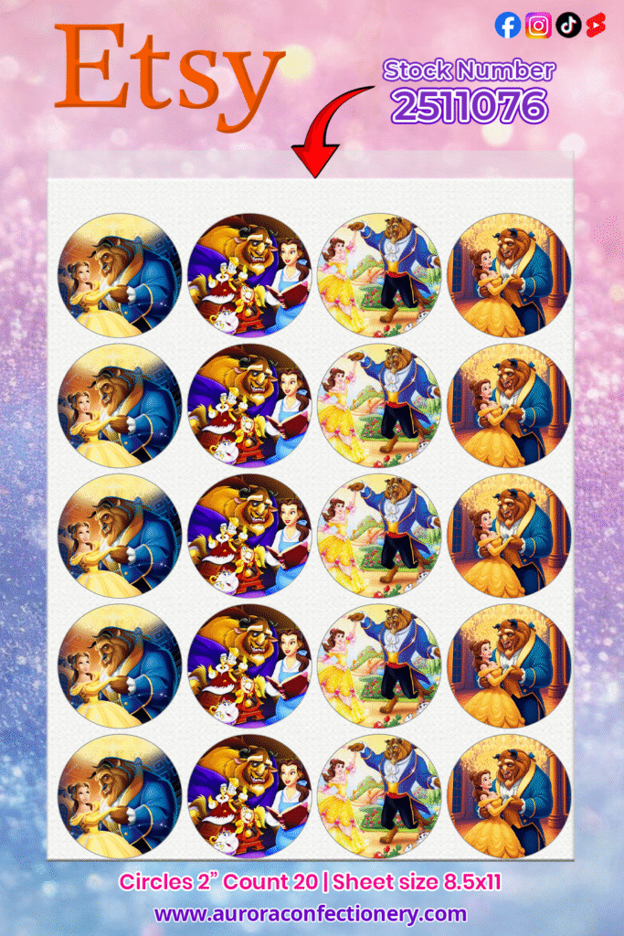 Add an enchanting touch to your next celebration with our Beauty and the Beast inspired edible cupcake toppers. This sheet features vibrant scenes of the beloved couple, including ballroom moments, character group portraits, and beautifully detailed illustrations, all printed on a premium 8.5″ x 11″ frosting sheet. Perfect for cupcakes, cookies, cake pops, and more, these edible images make decorating fast, polished, and party-ready.