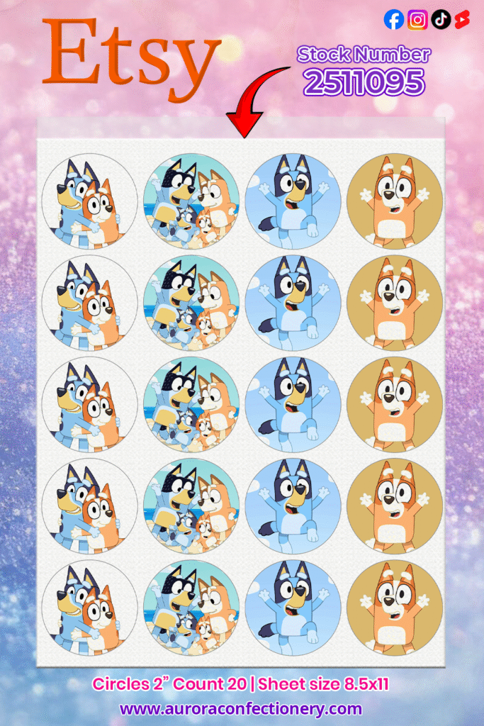 Our Bluey-inspired edible cupcake toppers are perfect for giving your party desserts a bright, joyful touch. This design features adorable cartoon-style dog characters in multiple poses, all printed on an 8.5″ x 11″ premium frosting sheet. Ideal for cupcakes, cookies, cake pops, and other small treats, these edible images make decorating fast, fun, and effortlessly professional.