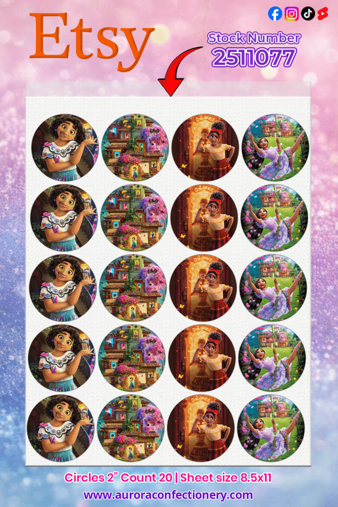 Our premium edible prints are perfect for Encanto themed birthdays, dessert tables, and magical celebrations of all kinds. With bold colors and crisp details, these toppers bring your party vision to life effortlessly. When you’re ready to order, be sure to use Stock #2511077 so we print this exact design for you.