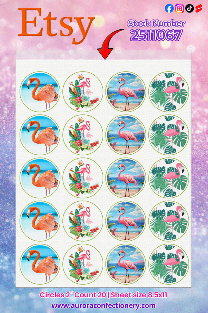 Our Flamingo Tropical edible cupcake toppers bring bright island vibes and elegant summer charm straight to your dessert table. This premium 8.5″ x 11″ frosting sheet features stunning flamingo illustrations, tropical leaves, coastal beach scenes, and floral arrangements—perfect for cupcakes, cookies, cake pops, or any summertime celebration. Made for party planners and hosts who want quick, professional-quality edible images with vibrant, vacation-ready style.
