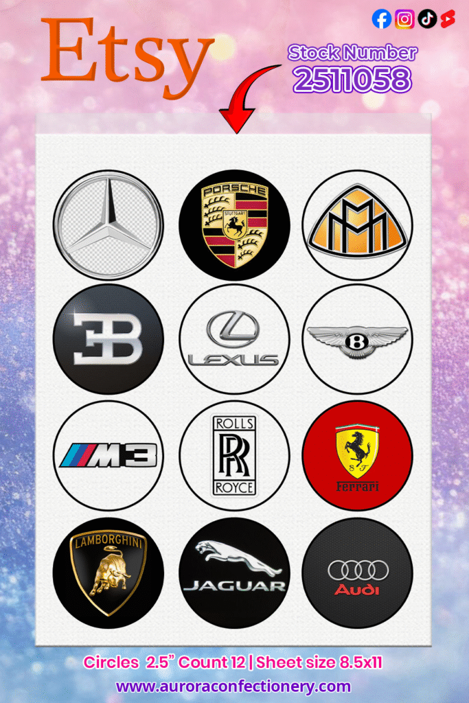 Our luxury car logo edible cupcake toppers are a sleek and stylish way to elevate any celebration. Printed on a premium 8.5″ x 11″ frosting sheet, this set features a collection of high-end automotive emblem designs that look bold and refined on cupcakes, cookies, cake pops, and more. They’re perfect for car enthusiasts, milestone birthdays, showroom events, and anyone who loves premium-themed desserts.