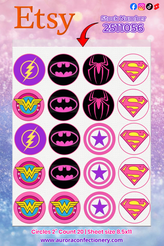 Our pink superhero edible toppers offer a premium decorating solution with bright colors and crisp details that instantly transform your desserts. Perfect for birthdays, themed events, school parties, and more, they help you achieve a polished look with minimal effort. When you’re ready to order, make sure to use Stock #2511056 so we print this exact design for you.