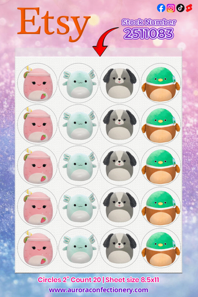 These premium edible prints are perfect for Squishmallow-themed birthdays, pastel party setups, kids’ celebrations, and dessert tables that need a cute and cozy touch. With crisp printing and charming character art, your treats will look professionally decorated in minutes. When you’re ready to order, remember to use Stock #2511083 so we print this exact design for you.