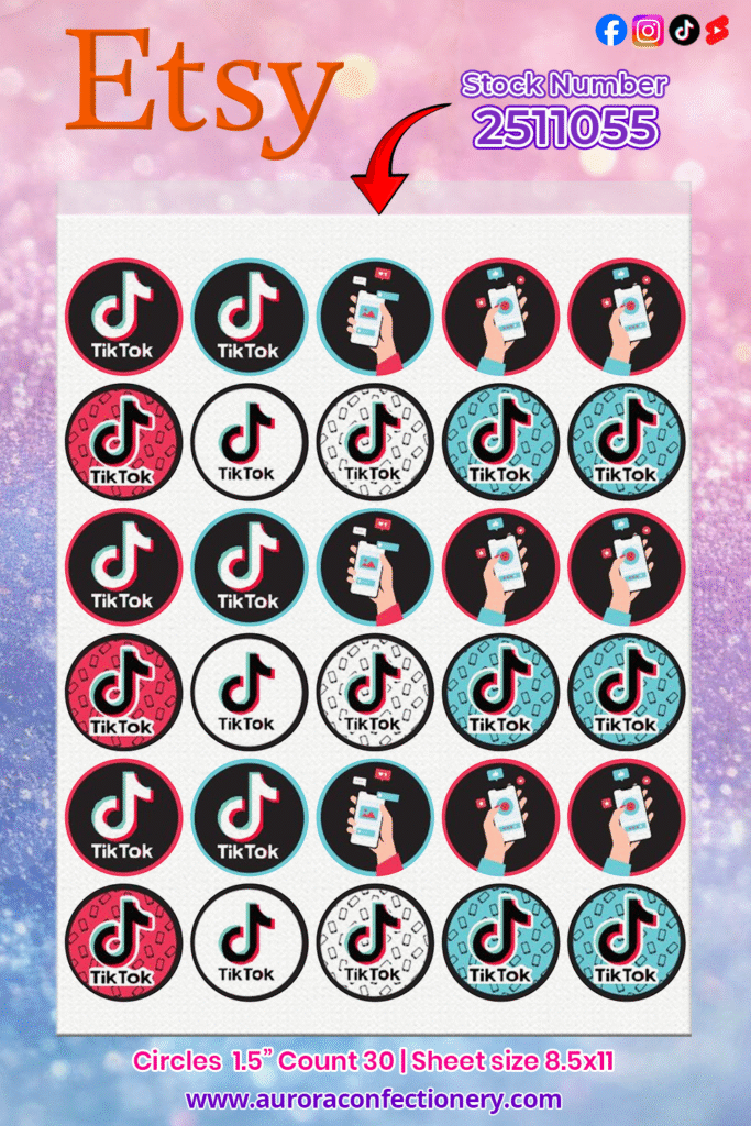These TikTok edible cupcake toppers bring trendy, high-energy style to birthdays, influencer parties, social media events, and dessert displays. Each sheet delivers professional-quality results with minimal effort. When you’re ready to order, make sure to use Stock #2511055 so we print this exact design for you.